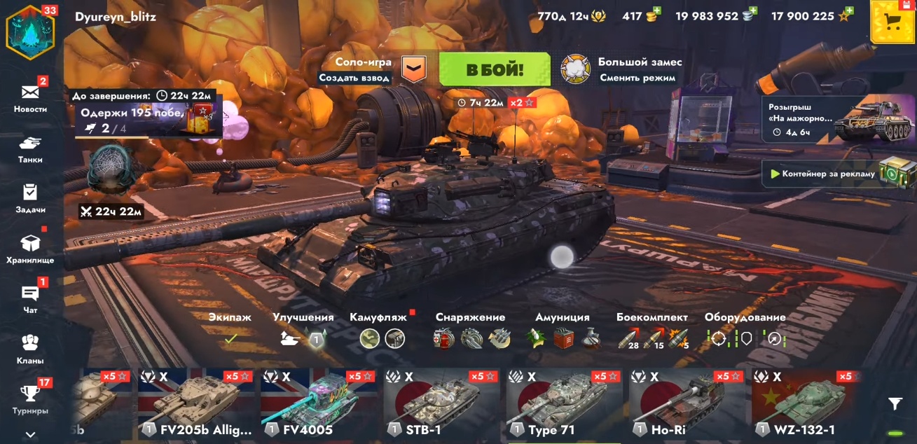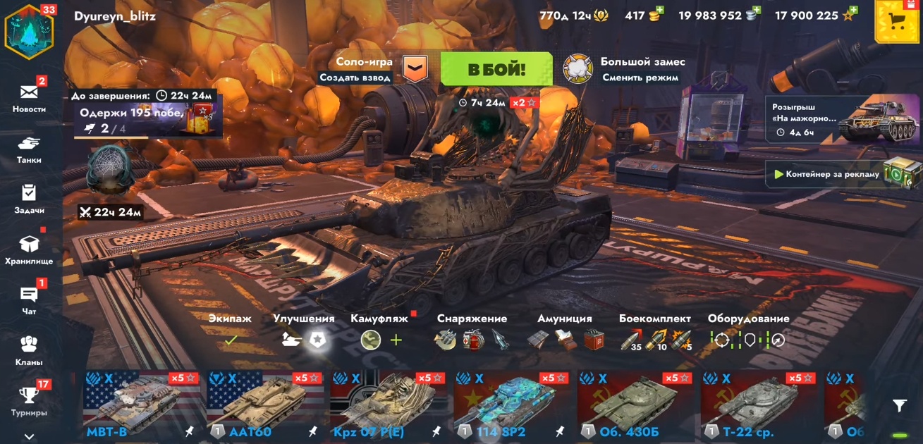 Также есть: об.780(лег камо), об.777(лег камо), ААТ60, об.268(лег камо), 114SP2(лег камо), tl-7-120,об.283, об.452к, об.752,Char Mle.75, Char Futur 4 все это в легендарных камо